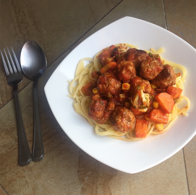 Low FODMAP and gluten free spaghetti and meatballs in a spicy tomato sauce (makes roughly 10 small meatballs)