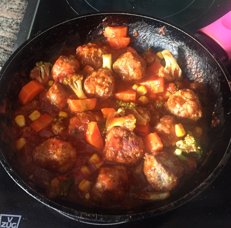 - In a hot frying pan, begin to fry off the meatballs until browned. Add the vegetables and continue to cook for 5 minutes.