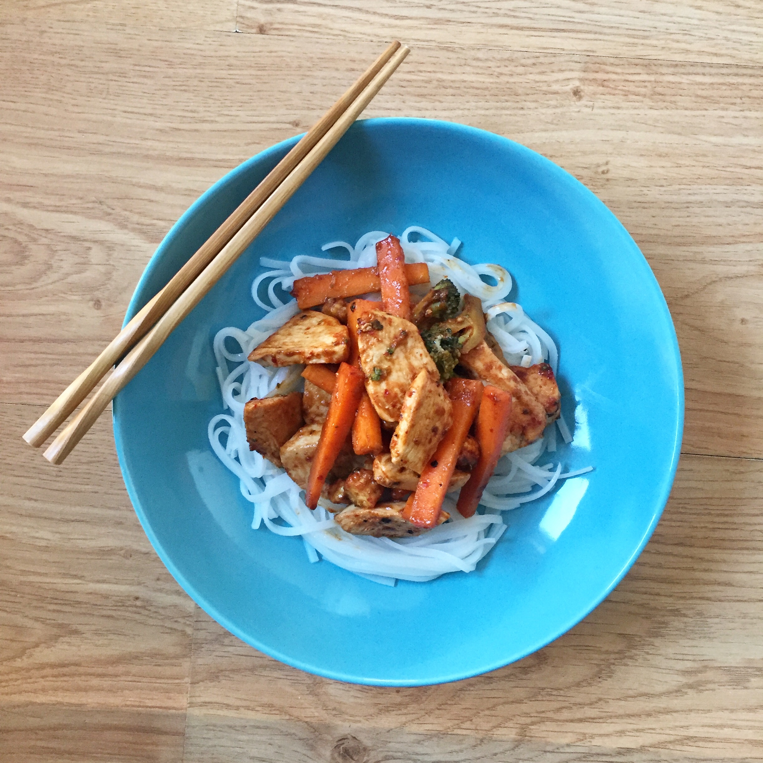 - Serve up your rice noodles in a bowl before adding the chicken and vegetable mixture on top.