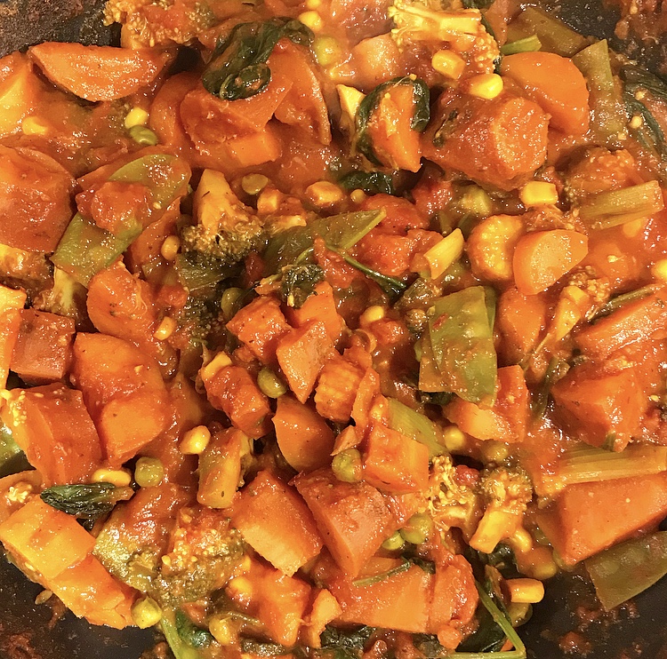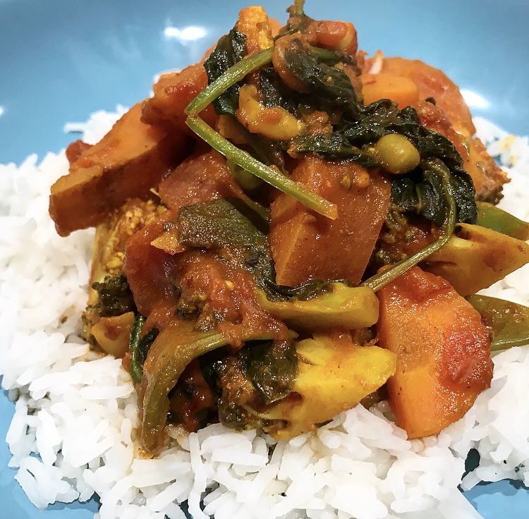 Low FODMAP, gluten free and vegan sweet potato, spinach and vegetable curry (makes 4 servings)