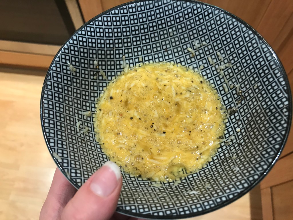 - In a separate bowl crack an egg, grate the gran Padano (finely) and add salt and pepper. Beat together and set aside.